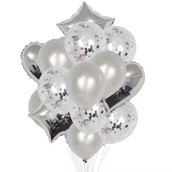 Premium quality balloons, foil stars, hearts latex and clear confetti balloons sets. It sounds like you’re planning to use a set of 14 assorted balloons, including multi-confetti balloons, star balloons, latex balloons, and heart foil balloons for your event decoration.
