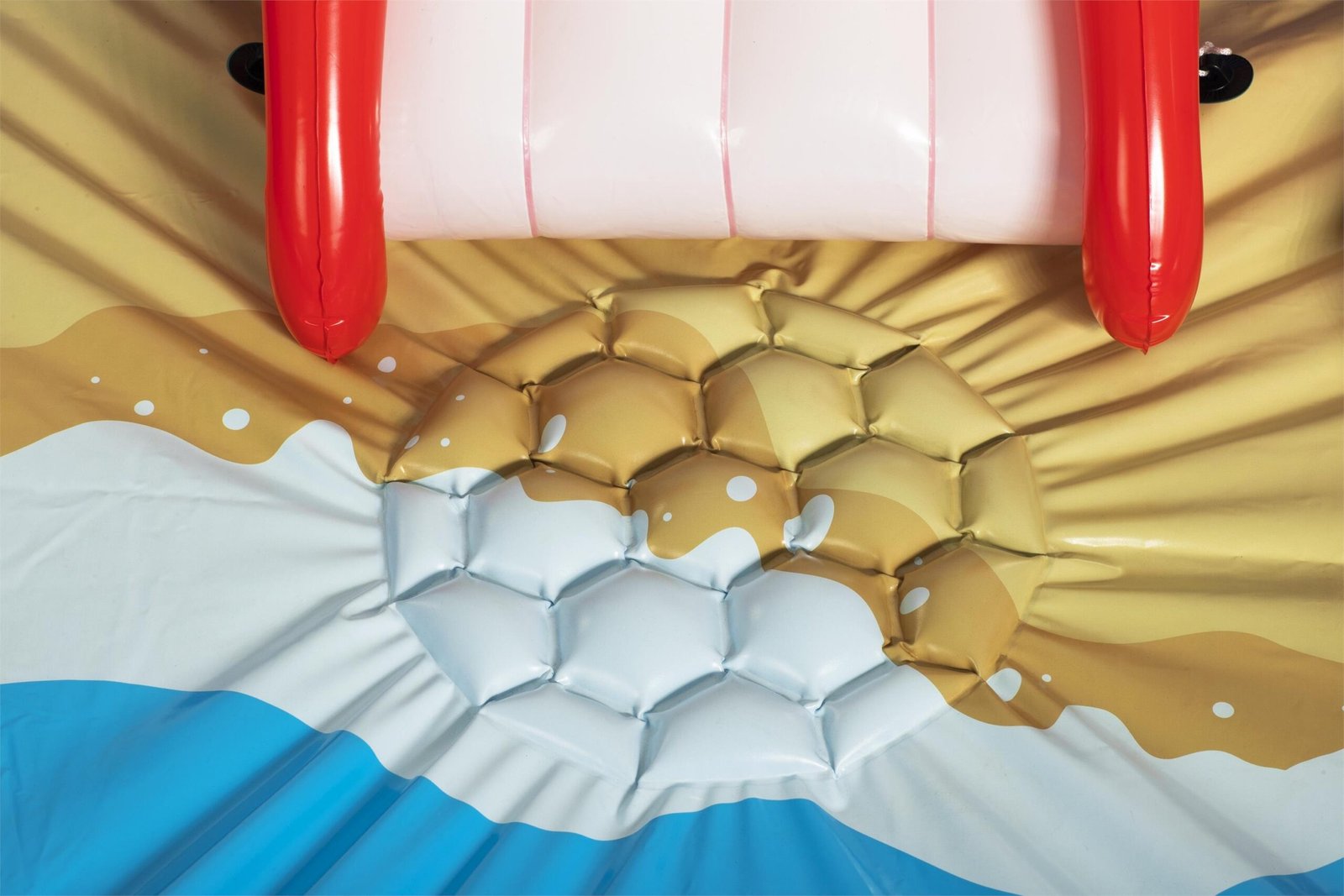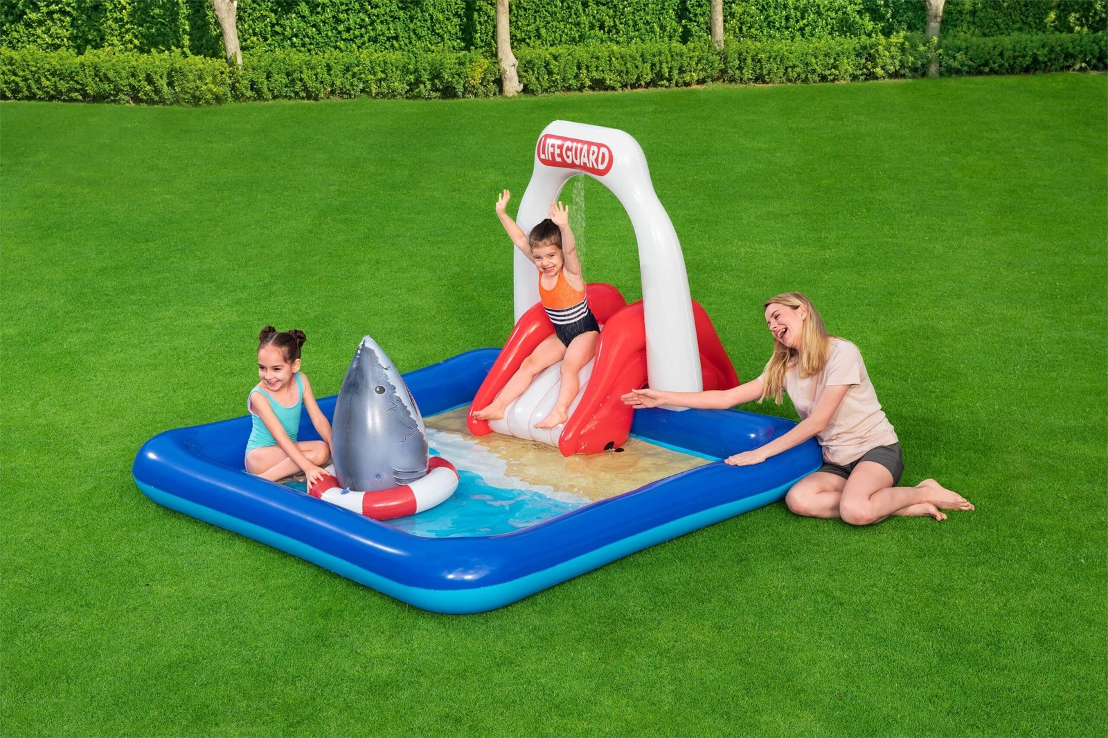 Look out for jaws! Let your kids and friends have a splashing great time with our Bestway Lifeguard Slide Play Pool. Featuring a wonderful play area with a jaws theme, the pool has fun removable slide that can be fixed to the pool with tie ropes and built-in grommets and plenty of interactive play with a bop bag (or inflatable punching bag) that can float on the water. Attach the garden hose to the lifeguard tower water sprayer and your kids will have an even more wet and wild time in this mini water park. Everything is made child-safe with the sturdy pre-tested vinyl, safety valves and cushioned floor at the foot of the slide for a safe landing. After all the splashing is over, the play pool can be easily emptied and deflated for safe storage until the next play time. Plus, a repair patch is included in case of accidental leaks so that your child can continue to enjoy aquatic fun for years to come.