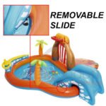 DESIGNED FOR SAFETY AND COMFORT: At the bottom of the slide, there’s an inflatable cushion space built into the pool floor for a safe landing! A detachable water-filled blob sits at the entry of the pool as well provides for a cushioned place to play or sit.