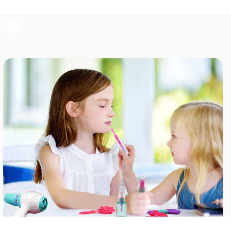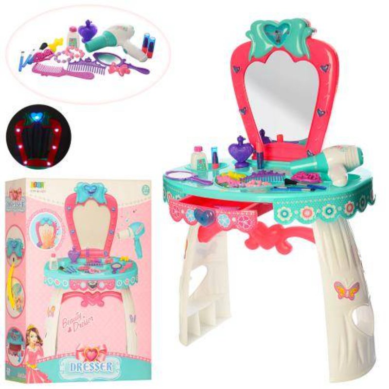 A hair dressing table, beauty tools with lights, beautiful music, a hairdresser or blow dryer for little girls, in addition to perfume, a hair comb, a set of neck chains and lipstick.