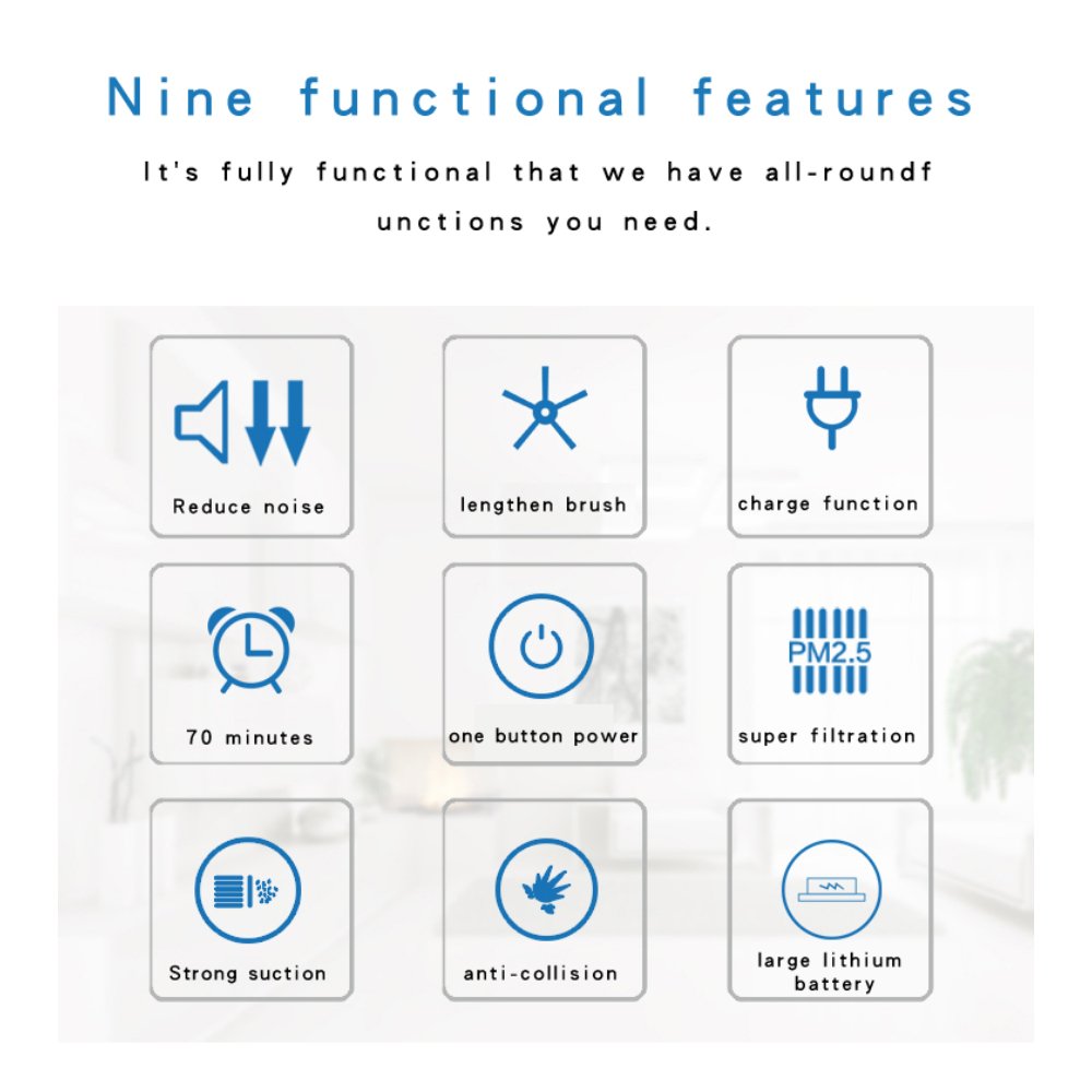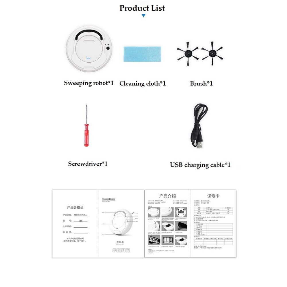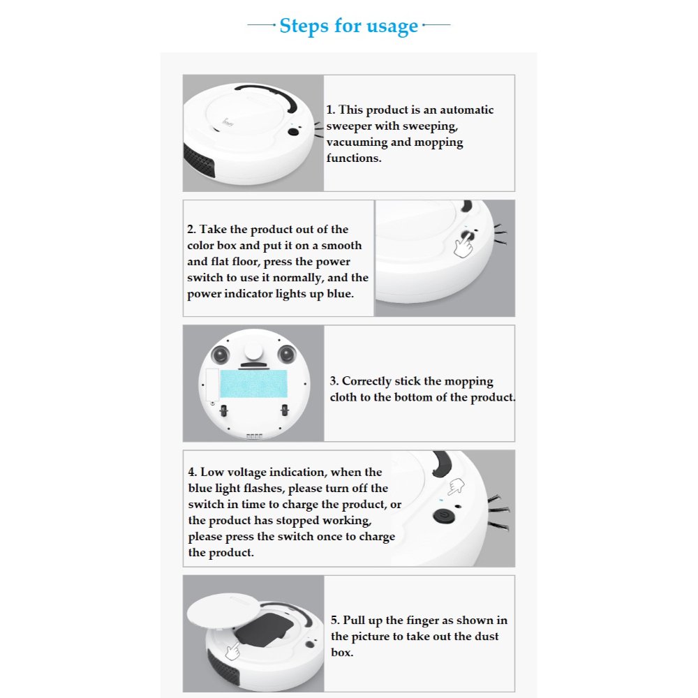 One-button start, sweep, mop, vacuum cleaner, USB charging, universal driving, automatic avoidance obstacles, anti-fall,
