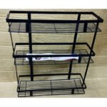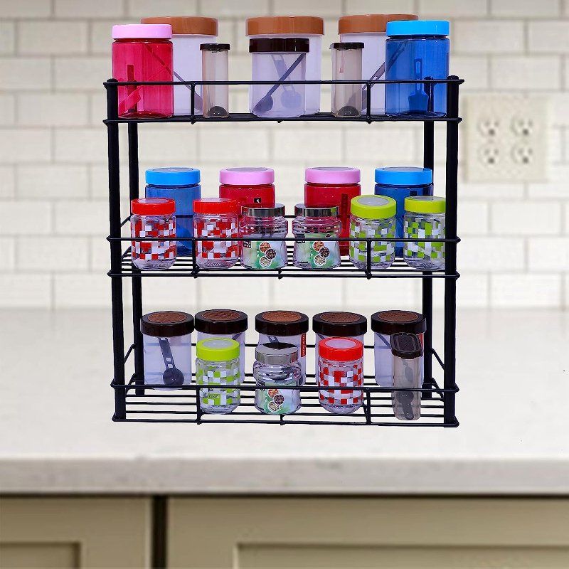 Introducing our versatile 3-tier multi-purpose metal kitchen storage shelf rack. This rack is not only durable and stylish, but it also maximizes your vertical space, allowing you to organize your kitchen essentials without sacrificing any countertop space. With its sleek design and no assembly required, it provides the perfect solution for decluttering not just your kitchen but any room in your home.