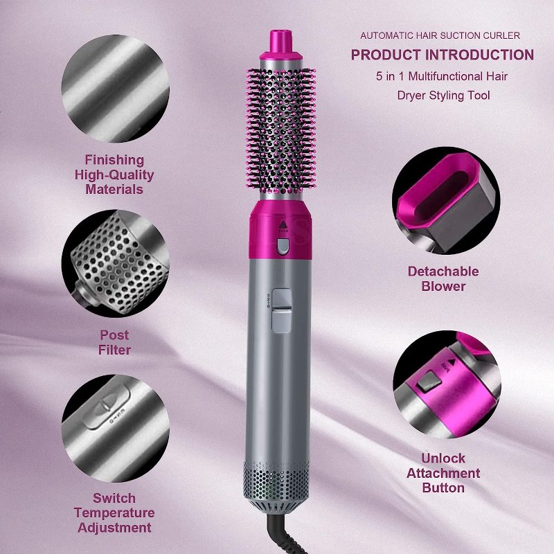 Introducing our 5-in-1 Hot Air Brush, the ultimate styling tool for all your hair needs. This versatile brush comes with five interchangeable heads, allowing you to dry, curl, straighten, and create beautiful styles with ease. Say goodbye to clutter and hello to salon-worthy results at home.