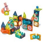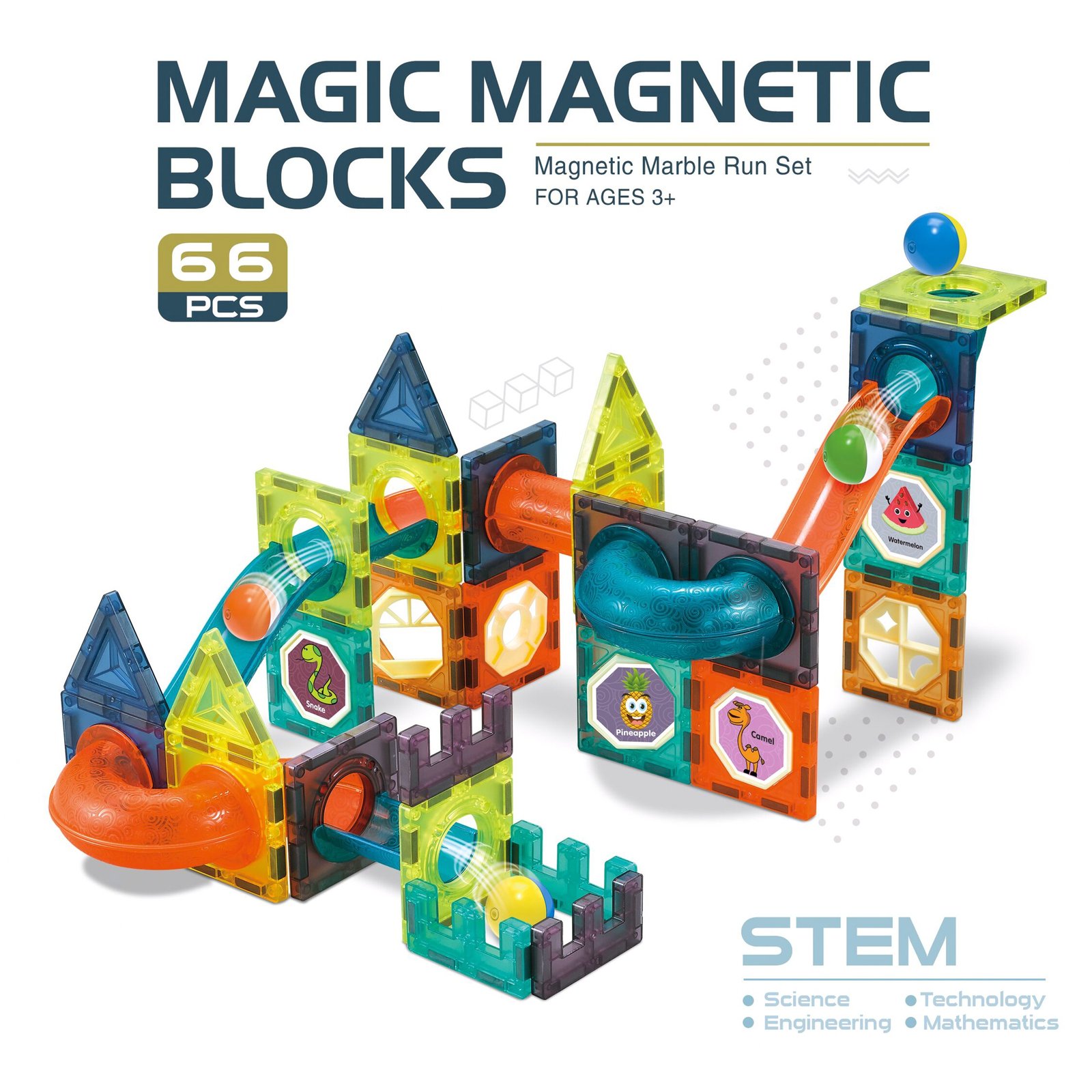 Children simply fit the rugged plastic pieces and magnetic blocks together to create action-packed marble mazes, complete with dips, drops, hairpin turns and more!