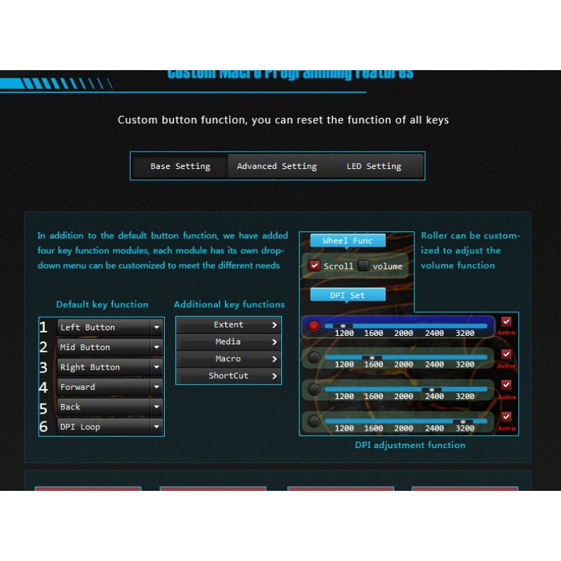 Adjustable DPI Setting: 800/1200/2400/3200 DPI, Up to 4000DPI by the Software.