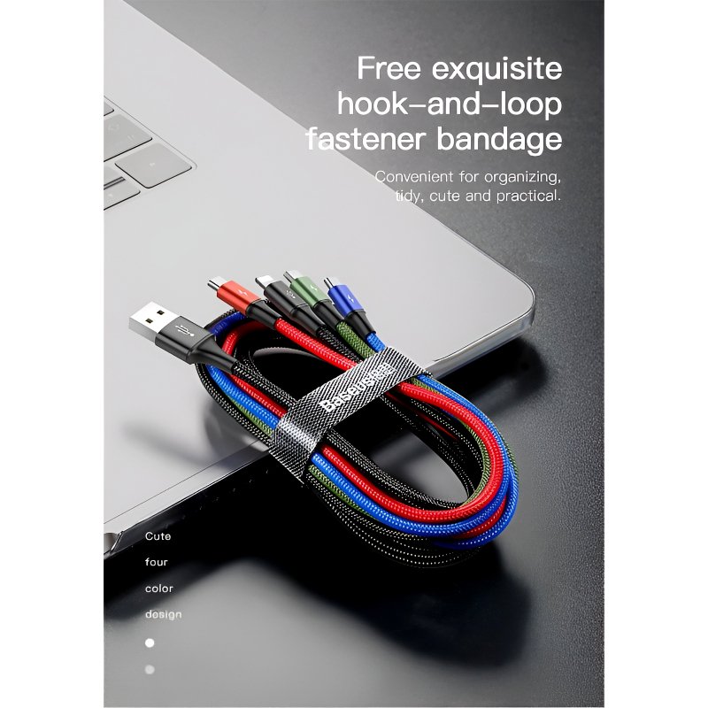 Stay connected and power up all your devices simultaneously with the Baseus 4-in-1 USB Charging Cable. This high-quality cable is designed for ultimate convenience, featuring 4 charging connectors—2 for iPhone (Lightning), 1 USB Type-C, and 1 Micro USB—allowing you to charge multiple devices simultaneously through a single USB connection.