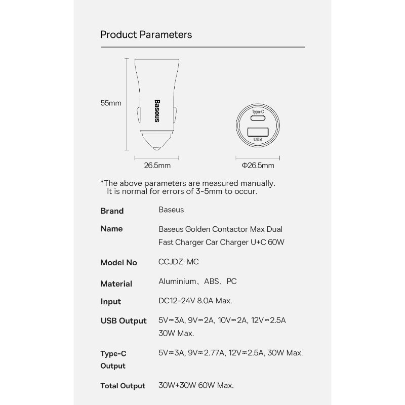What’s in the box: 1 x Baseus Golden Contactor 60W USB + Type-C Car Charger
