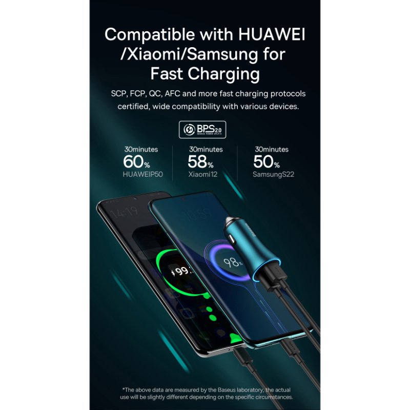 This charger is compatible with fast-charging protocols such as SCP, FCP, QC, and AFC, making it suitable for devices from HUAWEI, Xiaomi, Samsung, and more.