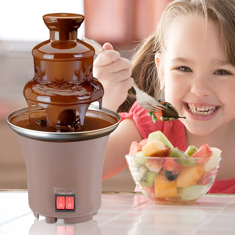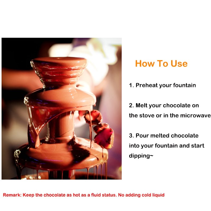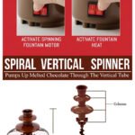 The fountain’s three-tiered design creates a beautiful cascading effect, with a spiral mechanism that keeps the chocolate flowing continuously. The heated bowl and tower ensure that your chocolate stays perfectly melted, allowing for even dipping of your favorite treats.
