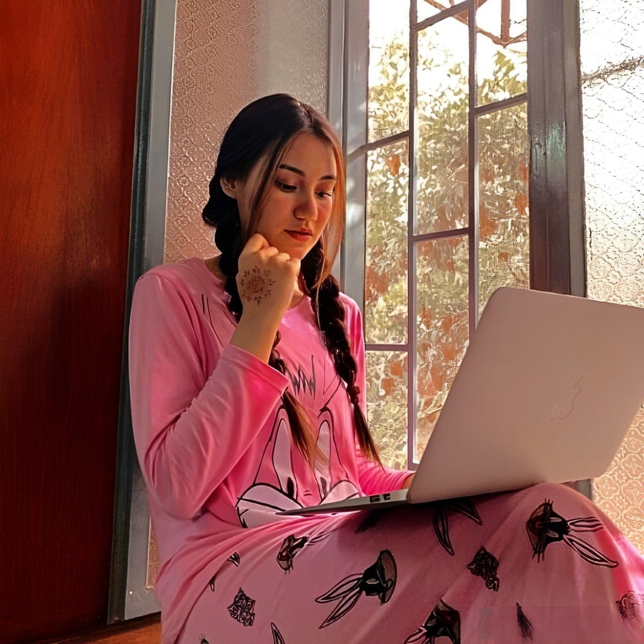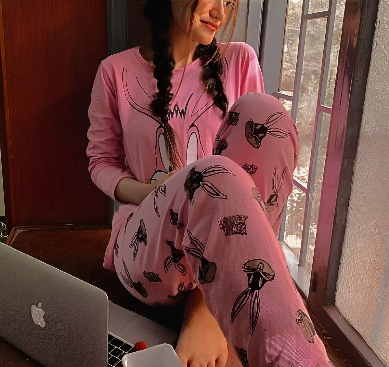 This sleepwear set combines comfort with a playful charm. The top is a soft pink color with a vibrant image of Bugs Bunny, radiating confidence and mischief.