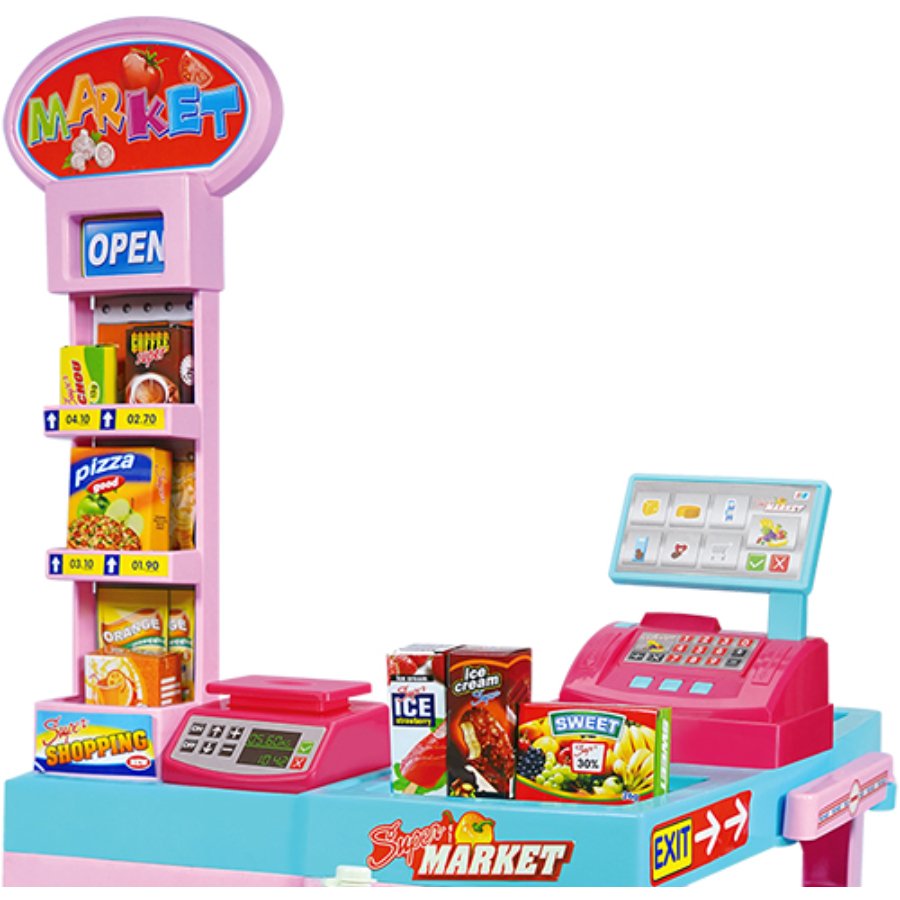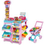 What’s in the box: 47 accessories, including Cardboard boxes with groceries, A set of vegetables and fruits for cooking, Shopping trolley on wheels, Bottles with juice and milk, A set of banknotes, Soda cans Cash desk with scanner, Grocery scales,