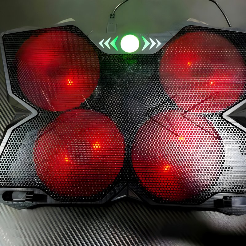 The F4 Plus Notebook Cooling Pad combines robust cooling performance with a sleek black design accented by vibrant streaks on its fan blades, catering specifically to hardcore gamers and intensive users alike.