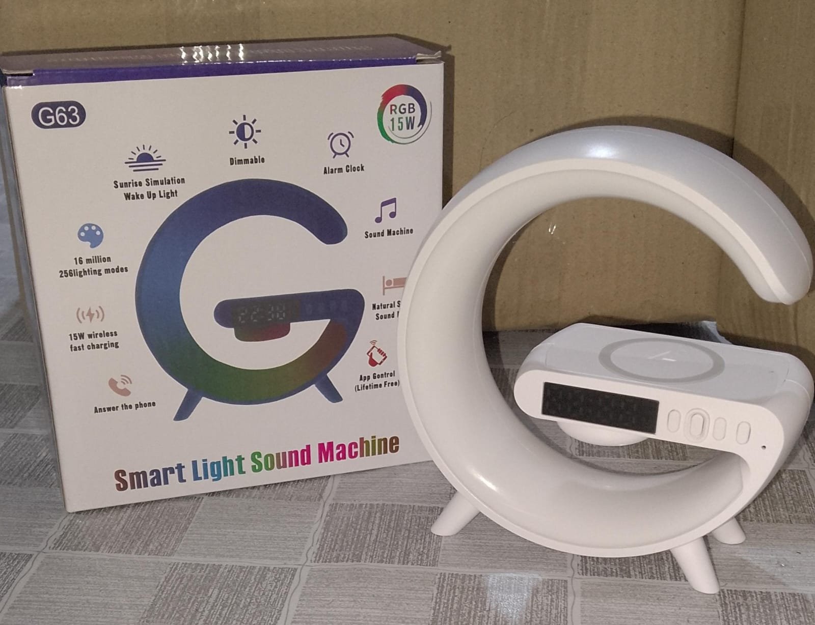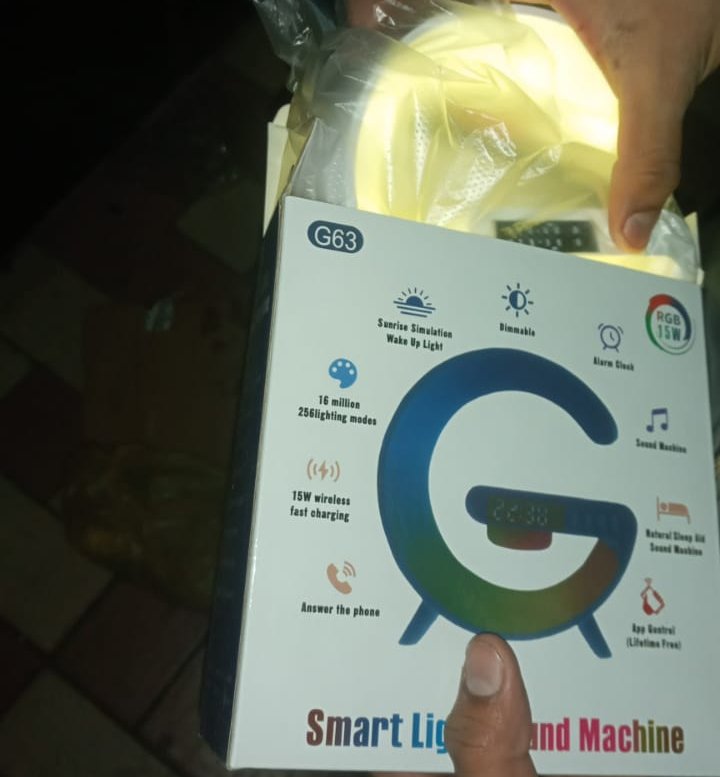 - pre • G63 RGB Light Bluetooth Speaker with 10W wireless charging• Multifunctional 4 in 1 Wireless Charger LED Atmosphere RGB Night Light• Alarm Clock Desk Lamp Bluetooth Speaker Wireless Charging• Modern Speaker gaming speaker and alarm clock• Portable Speaker Features: Alarm Clock, Volume control, 3D sounds• Headphone Jack, Digital Display, Rechargeable, Docking Station• Built-in Battery: Yes