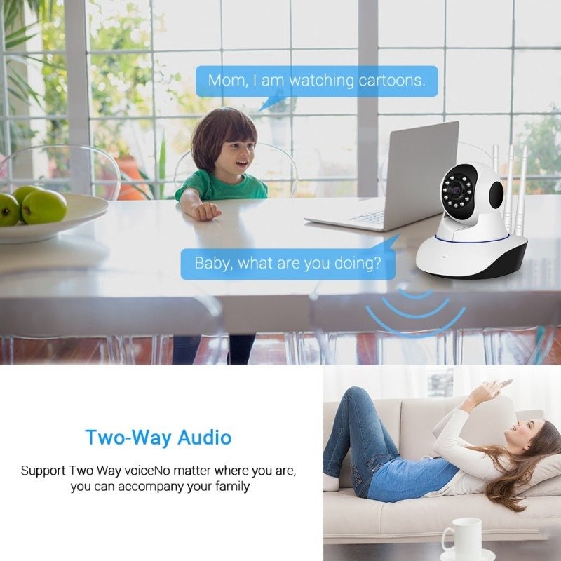 Two-way Audio: With anti-noise technology and a built-in microphone and speaker, you can live watching with your loved one or scare away intruders and real-time talking with visitors no matter where you are.