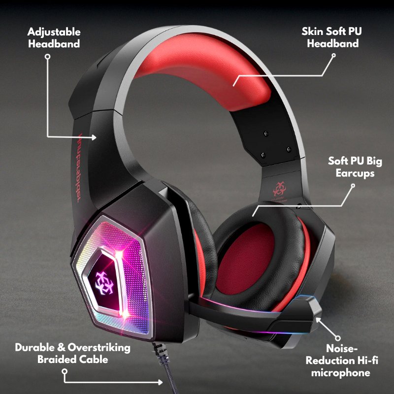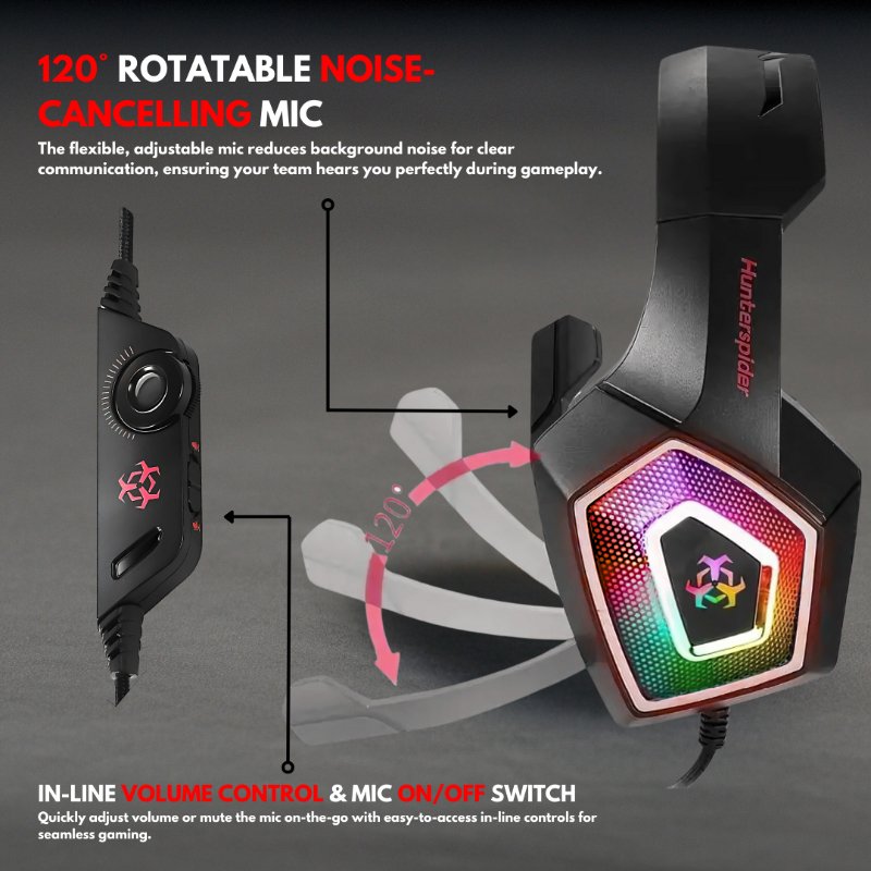Immerse yourself in the ultimate gaming experience with the Hunter Spider V1 RGB Gaming Headset, engineered for precision, comfort, and high-performance audio. Featuring true 7.1 virtual surround sound powered by 50mm neodymium drivers, this headset delivers immersive, directional audio, letting you hear every critical detail, from enemy footsteps to explosive in-game action. The 120° rotatable noise-cancelling microphone ensures crystal-clear communication by filtering out background noise, while deep bass technology enhances explosions and sound effects for an even more immersive gaming experience.