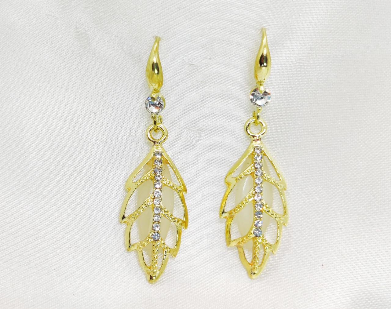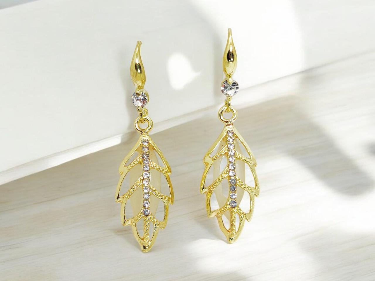 - Add a touch of elegance to your look with these exquisite golden leaf earrings. Designed with intricate craftsmanship, the earrings feature a delicate leaf pattern adorned with sparkling crystals, giving them a radiant shimmer.