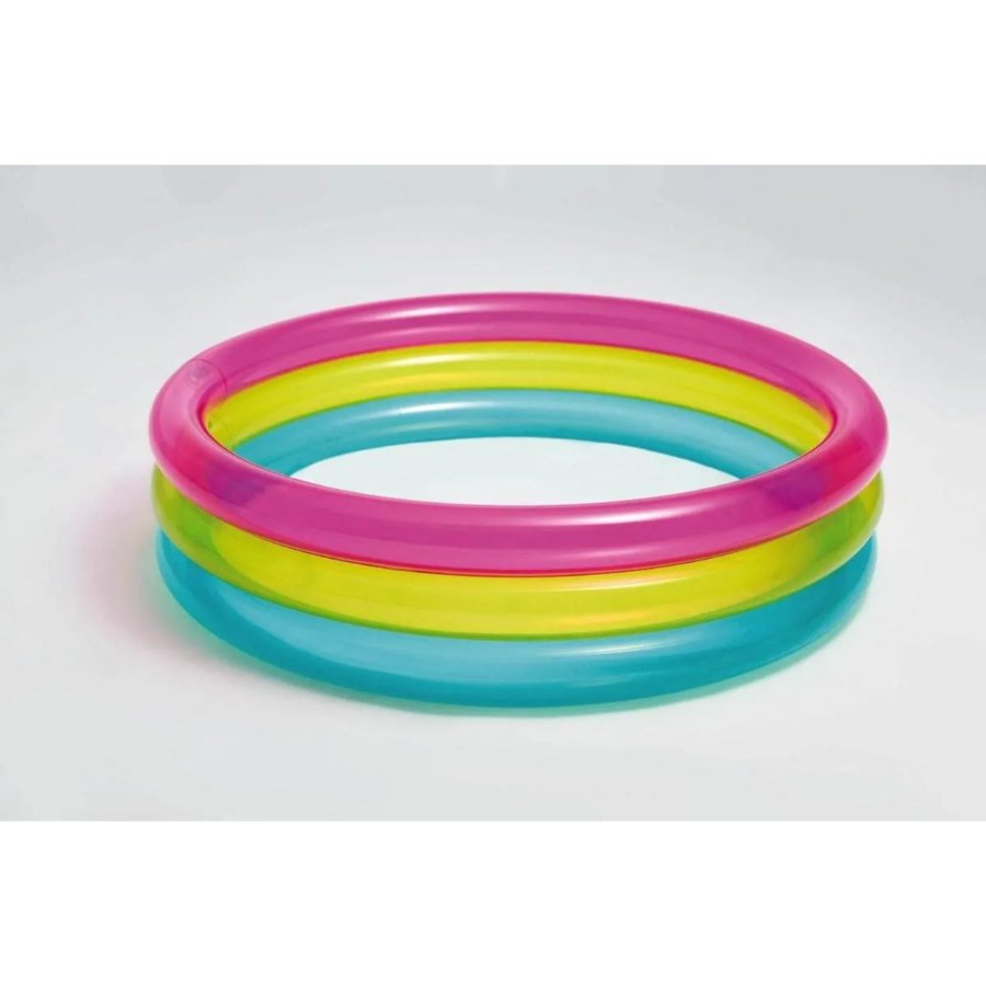 Includes 3 inflatable rings color pink, yellow and blue, water capacity 57 Liters, filling level suggested 18 cm