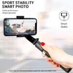 Switch to gimbal mode for automatic balance and stable performance in all directions. The adjustable head allows for horizontal and vertical shots with 180° automatic locking. The included wireless remote control (Bluetooth V4.0, 120mAh) ensures hands-free shooting, and the foldable, lightweight aluminum alloy design (216g) makes it portable and travel-friendly.