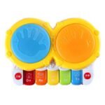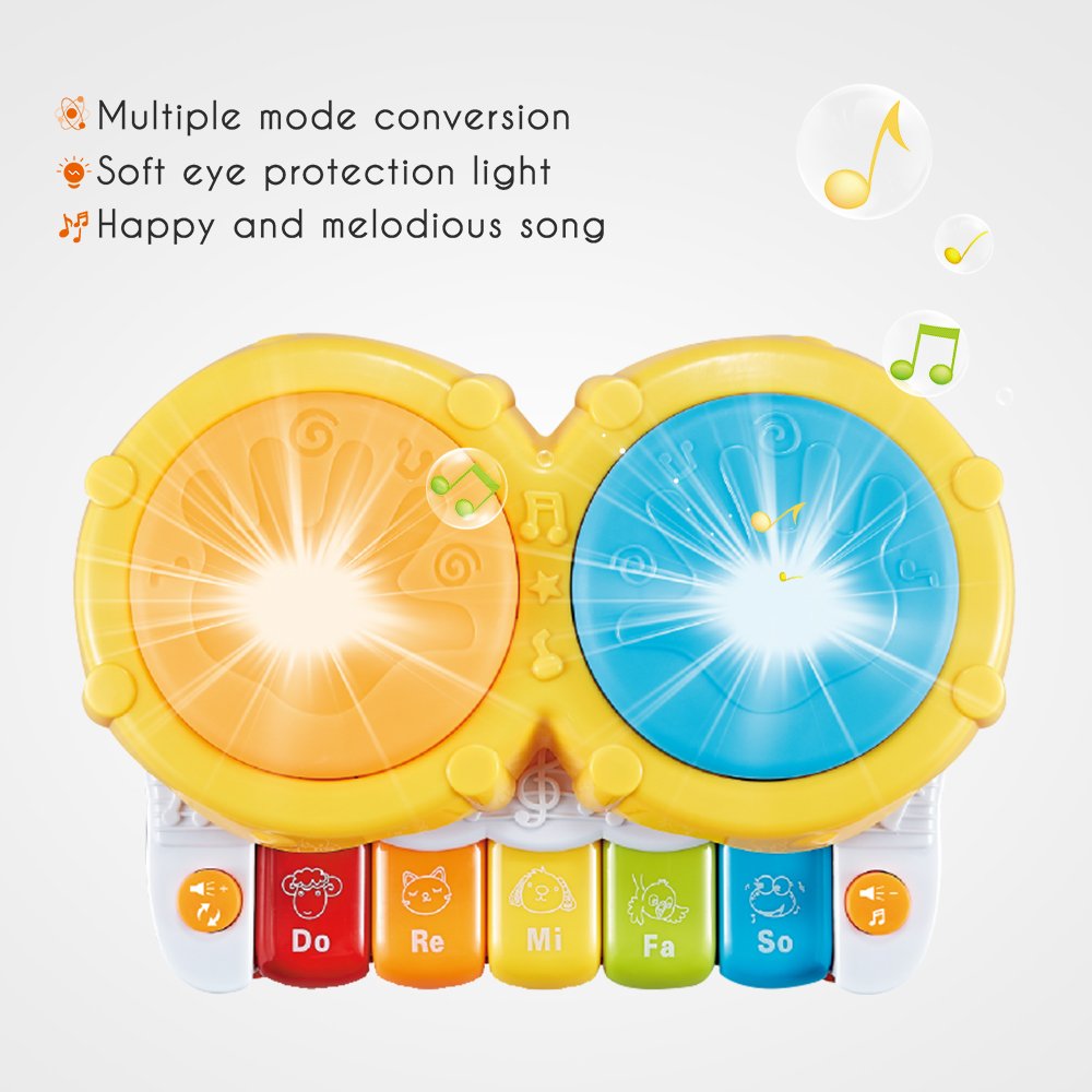 EXCELLENT EARLY EDUCATION BABY TOY:Baby will discover kinds of musical instrument sounds, songs and Baby’s laughter by pressing toy buttons. 5 keyboards, 3 light-up hand drums buttons. Drum can play with multiple babies at the same time, or Parents and babies can enjoy happy family time together. Requires 3*1. 5V battery (not included)Perfect baby toys 6 12 month.