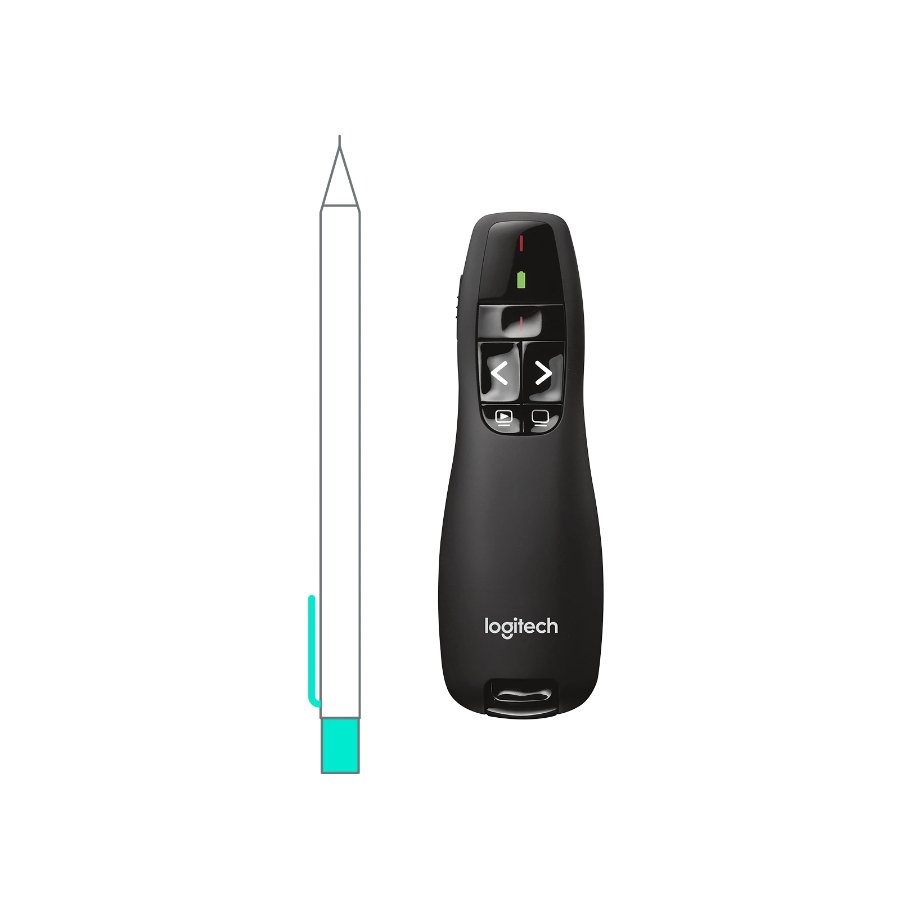 Logitech Wireless Presenter R400 is designed to help you make your point. Its intuitive slideshow controls help you navigate through your presentation with confidence. Buttons are easy to find by touch. And its shape feels great in your hand. It’s got a red laser pointer that’s easy to see against most backgrounds and a range of up to 50 feet (15 meters), so you’ve got the freedom to move around the room and mingle with your audience. A storable plug-and-play wireless receiver makes it simple to get started—there’s no software to install. And when you’re through, the receiver stores inside the presenter to make packing up easy.