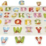 The alphabet puzzle board aims to help develop letter recognization and matching skills.