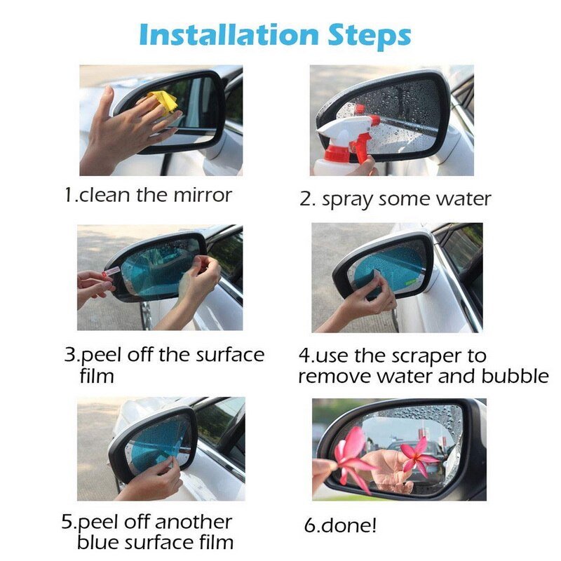 Installing this Car Anti-Water Mist Film is a breeze. In just a few minutes, you can apply it directly to your rearview mirror. Simply spray a bit of water on the mirror, place the protective film, and use a small scraper to ensure a secure and smooth fit.