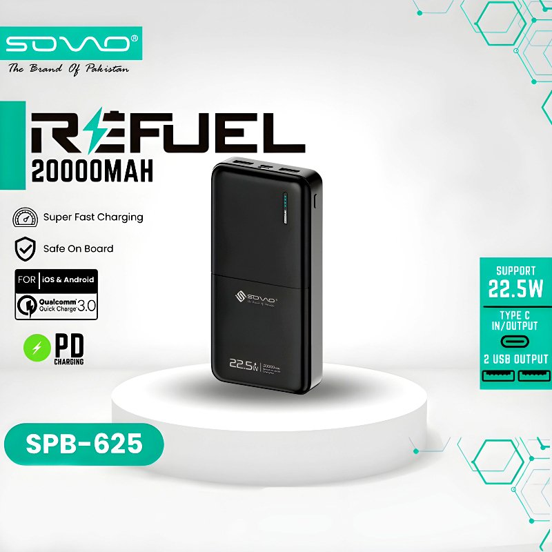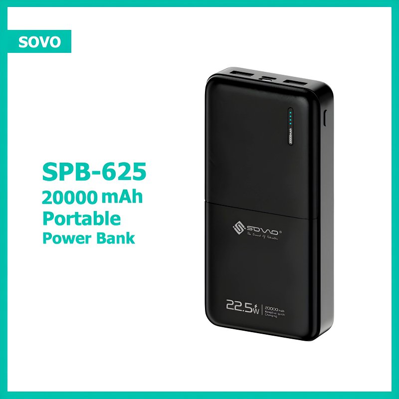 The Sovo Powerbank Model SPB-625, aptly named Refuel, is designed to keep your devices powered up wherever you go. Boasting a robust 20,000mAh battery capacity, this powerhouse ensures you stay connected and powered throughout your day, whether on a business trip, outdoor adventure, or on-the-go.