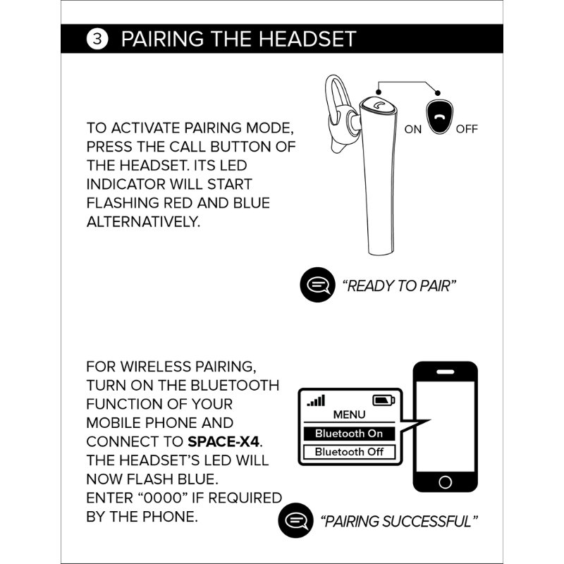 To pair, activate pairing mode by pressing the call button until the LED flashes red and blue, then turn on Bluetooth on your device and select “SPACE-X4,” entering “0000” if prompted; for multipoint pairing, repeat these steps with a second device before turning on the headset to auto-connect to both.