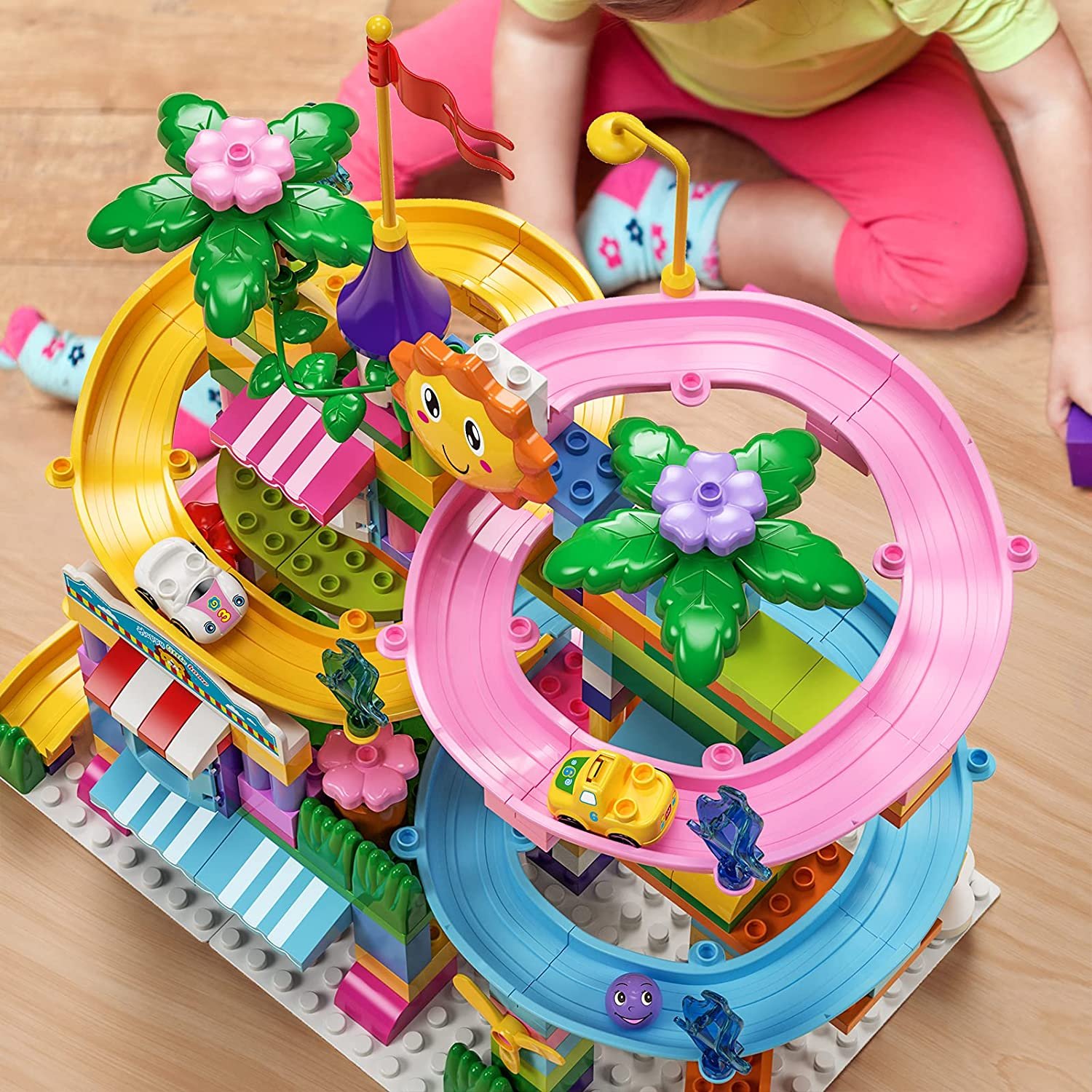 The building block track contains many colours and shapes, which has tracks, slides, cars, balls, windmills, castles, tables, doors, windows, sunflowers, trees, grass, streetlights, etc 187 pcs.