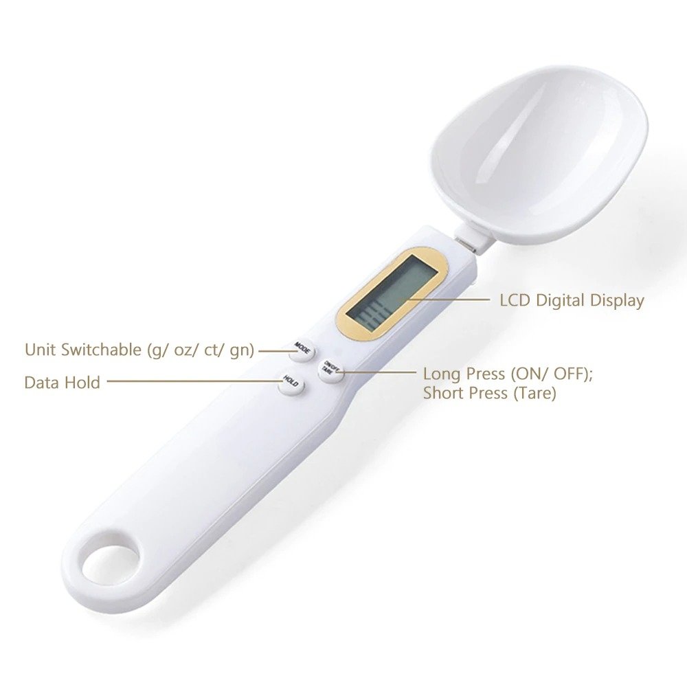 Digital spoon scale with LCD display. Powerful battery operation with low energy consumption