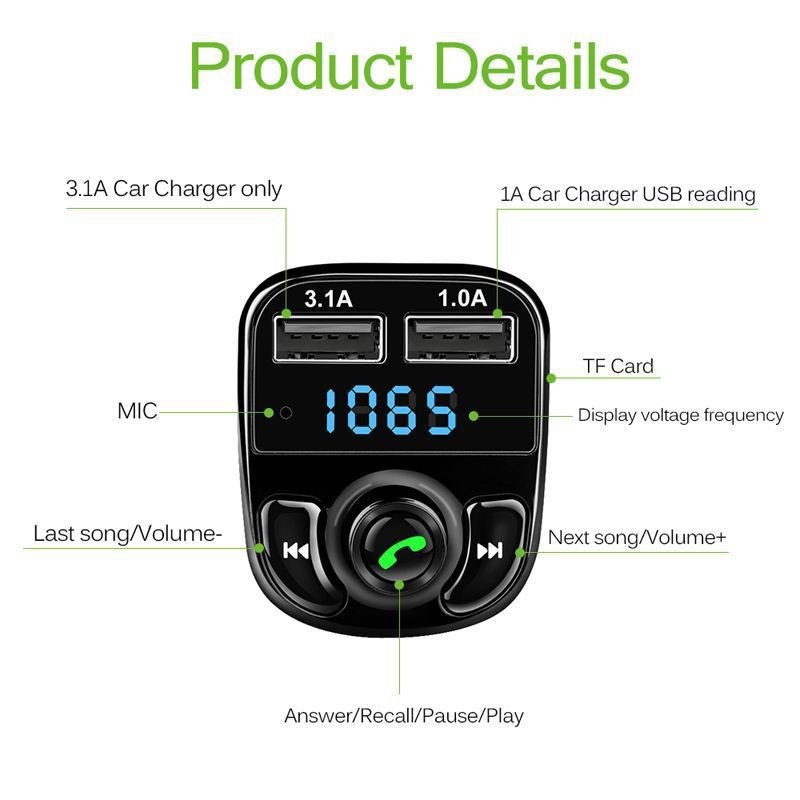 • ❧Enhanced Charging: By using advanced technology, this FM transmitter for car comes with dual USB ports for fast charging. With 3.1A output, you can quickly charge two devices at once, providing a worry-free driving experience.